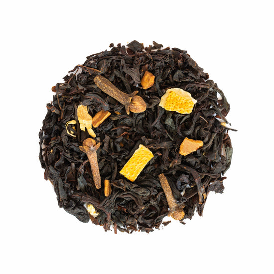 Black tea with flavours of cinnamon, cardamom, cloves, and bitter orange. Decorated with orange peel and clove.