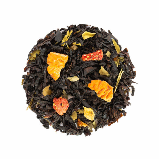 Black tea with flavours of strawberry and vanilla. Decorated with apple pieces, blackberry leaves, and strawberry pieces.